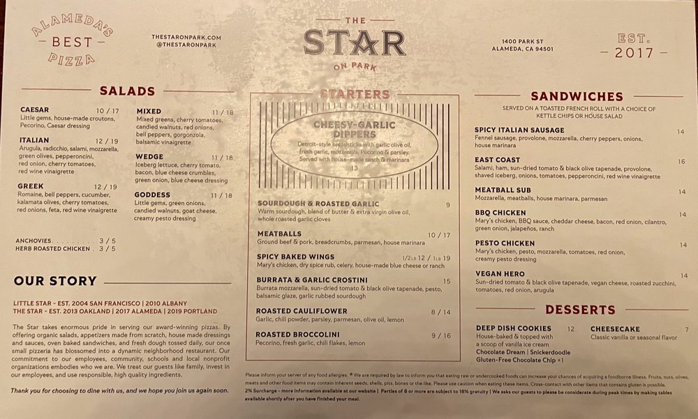 Welcome to The Star on Park, an alluring addition to the culinary scene in Alameda that expertly blends the best of Italian pizza with a vibrant bar atmosphere. This trendy establishment emphasizes a casual, yet inviting dining experience, making it ideal for everything from spontaneous lunches to lively dinner gatherings.